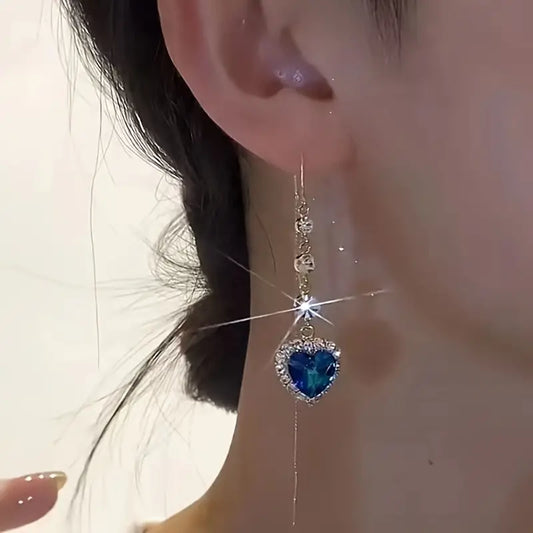 Vintage Glamour Heart-Shaped Blue Rhinestone Tassel Earrings