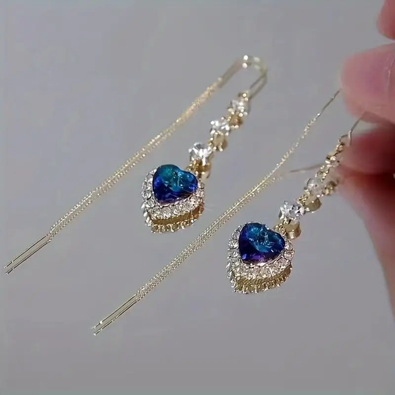 Vintage Glamour Heart-Shaped Blue Rhinestone Tassel Earrings - Dazzling Synthetic Stone, Hypoallergenic Alloy Ear Needle, Exquisite Rhinestone Mosaic Design, Perfect Gift for Women on Daily, Special Occasions, and Any Season
